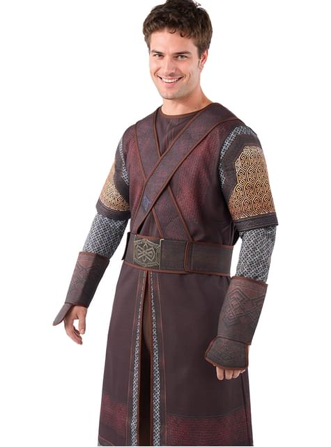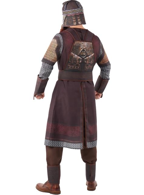 Το κοστούμι για άντρα αποτελείται από ένα μακρύ ρούχο σε καφέ αποχρώσεις με εκτυπωμένες λεπτομέρειες που μιμούνται μέταλλο και δέρμα, μανίκια με εφέ πλέγματος και διακοσμητικές πανοπλίες. Περιλαμβάνει άσπρο κράνος, πλεχτή γενειάδα, ζώνη, ρούχο, παντελόνι, καλυμματές και περιβραχιόνια, όλα φτιαγμένα από πολυεστέρα και πολυεθυλενο-τερεφθαλάτη. Το σύνολο προσφέρει άνεση και αντοχή, ιδανικό για να κινείστε ελεύθερα κατά τη διάρκεια όλης της εκδήλωσης.